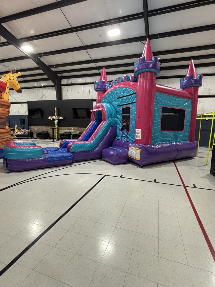 Bring a burst of sweet fun to your next party with our Bubblegum Castle. This bright pink, teal, and purple combo bounce house is every child’s dream. Featuring a large jumping area, basketball hoop, and an attached slide, it’s perfect for birthdays, school events, church festivals, and backyard celebrations.