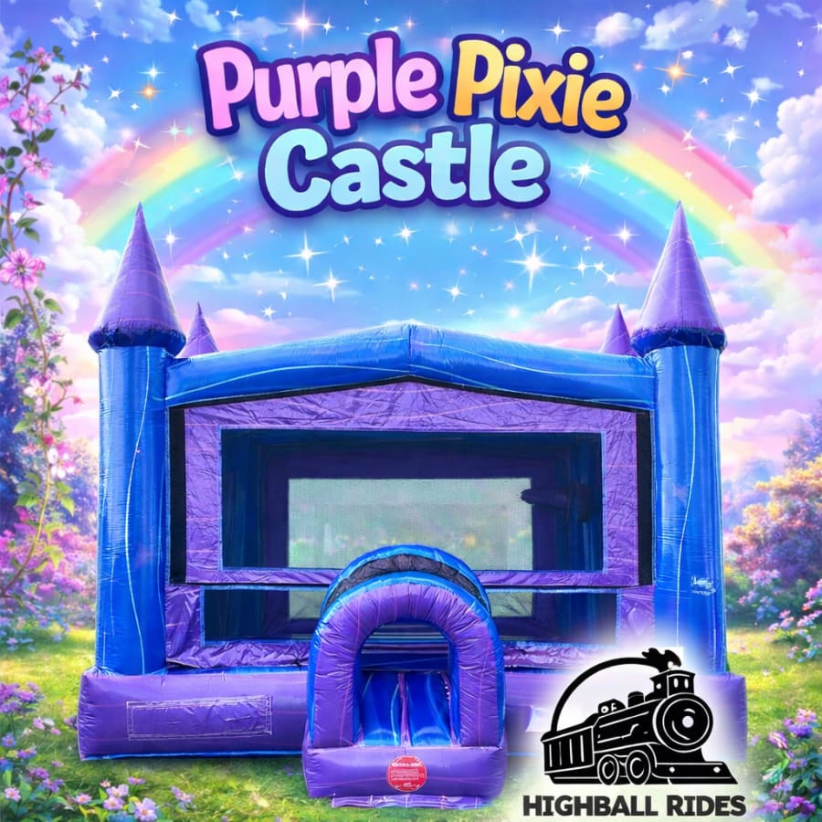 The Purple Pixie Castle is a bright purple and blue bounce house designed for princess parties, fairy themes, and any child who loves the color purple. Its castle-style shape and spacious bounce area make it a perfect fit for birthdays, school events, and backyard celebrations.