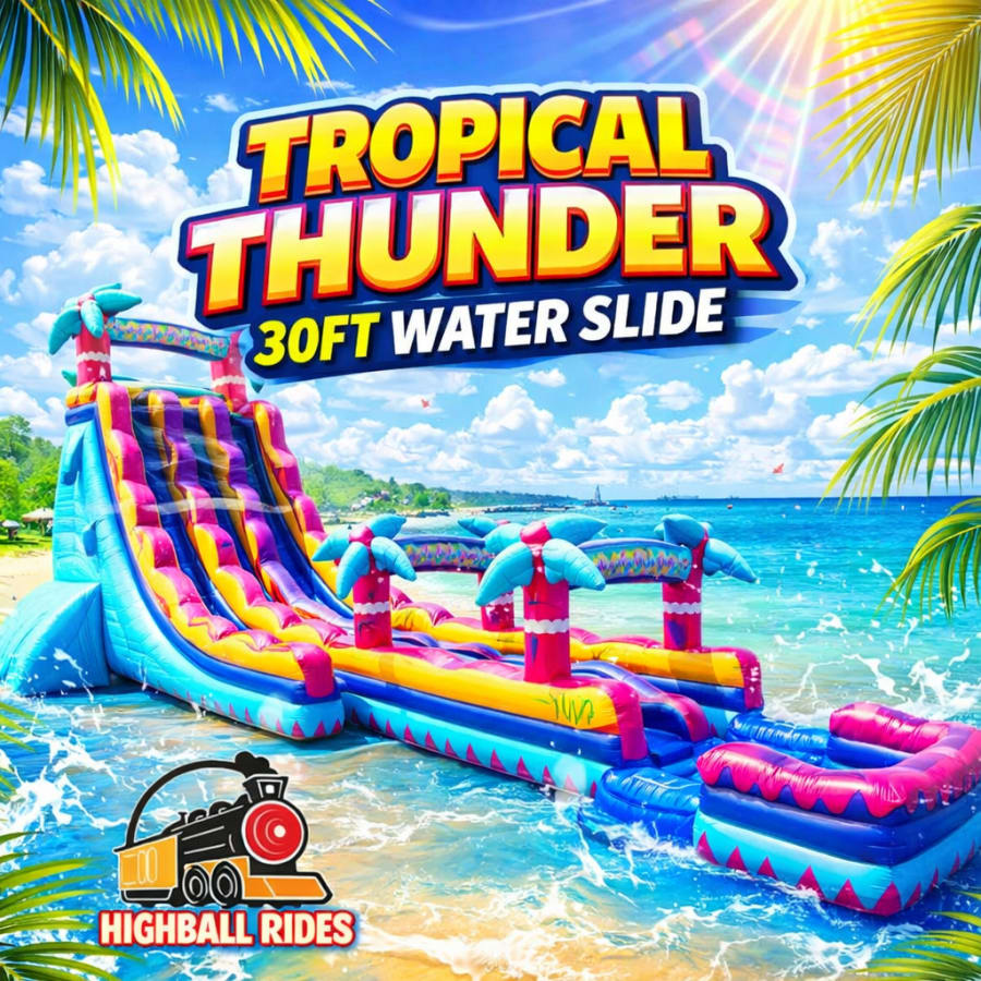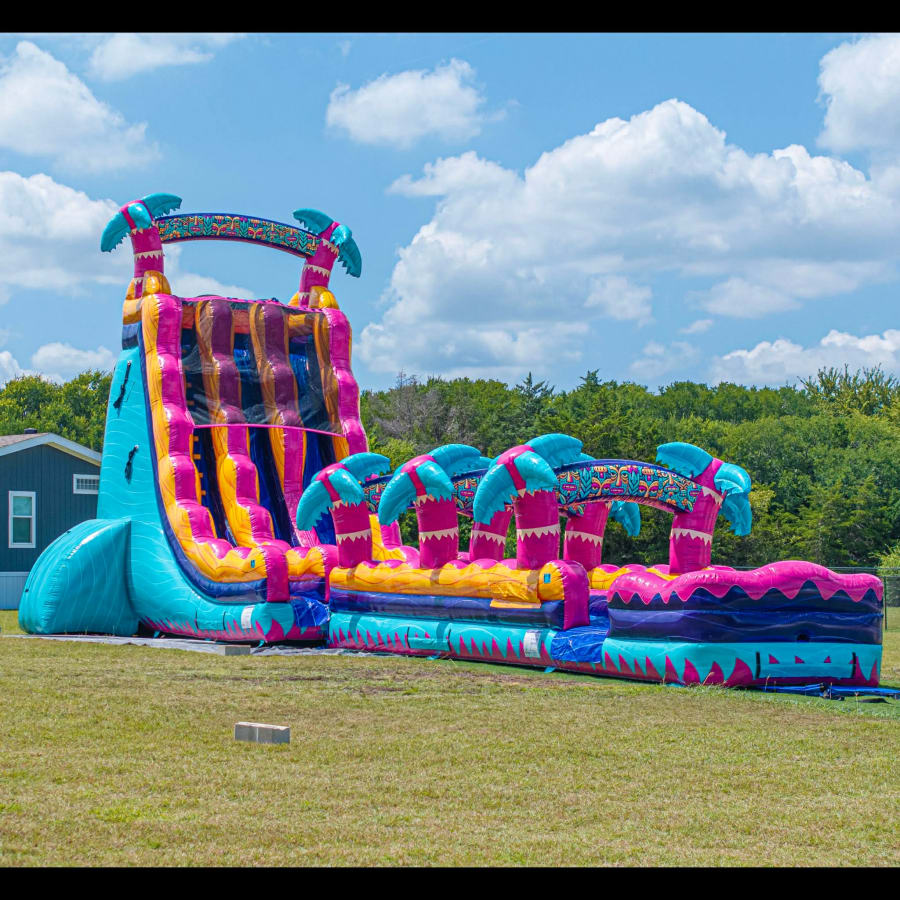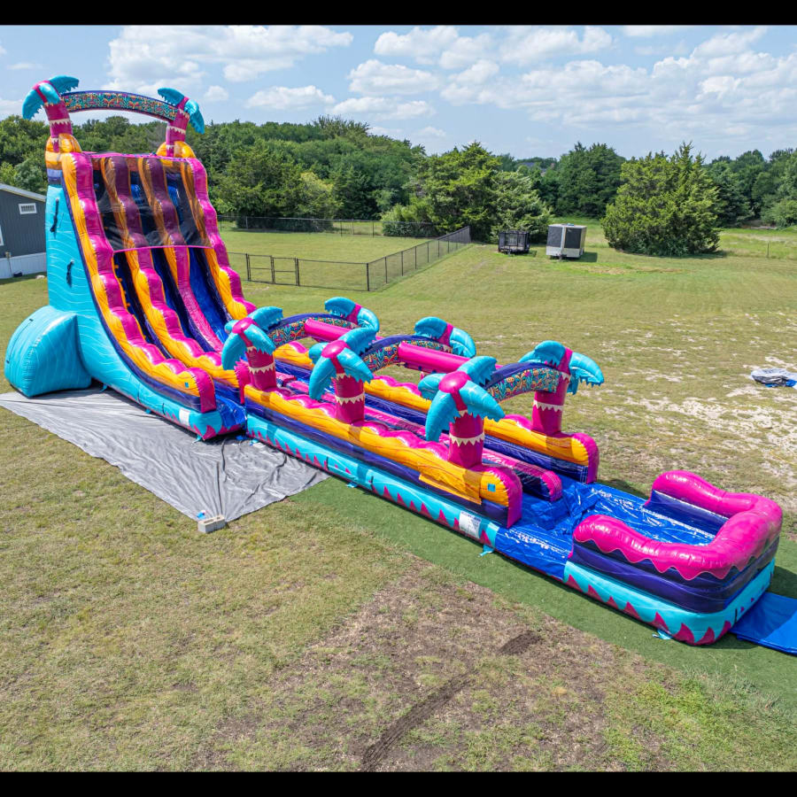 The Tropical Thunder 30-Foot Splash is the ultimate centerpiece attraction for any summer event. Towering at an impressive 30 feet tall and stretching more than 75 feet in total length, this waterslide delivers a fast, thrilling ride from top to bottom. Riders climb to the elevated platform, take in the view, and launch into a steep drop that leads into an extra-long dual-lane slip-n-slide runout, creating a high-energy race to the finish. Designed with bold tropical colors and palm-tree accents, this slide instantly transforms any space into a vibrant island-themed experience.