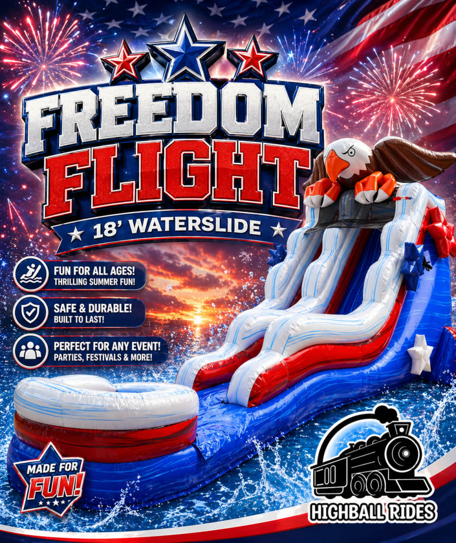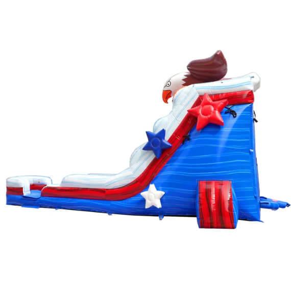 Take your party to new heights with the Freedom Flight 18’ Water Slide — a bold, patriotic inflatable that delivers fast, refreshing fun all day long. Featuring a towering bald eagle design and vibrant red, white, and blue colors, this slide is guaranteed to be the centerpiece of any event.