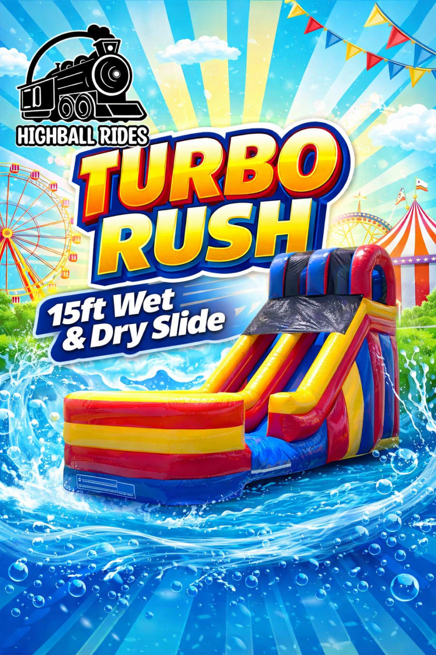 The Turbo Rush is a top choice for backyard parties, preschool and elementary events, church gatherings, and summertime celebrations where younger riders want to slide, splash, and stay entertained.
